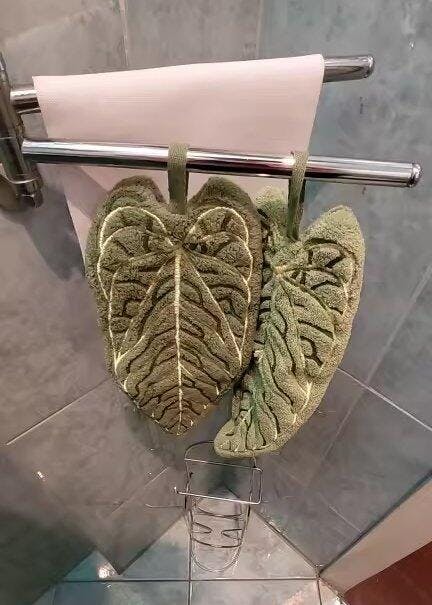 Together they look like a tiny jungle duo sitting by your faucet. The surface is velvety and plush, with cream-colored raised veins that give each towel a realistic leaf look. They don’t feel like boring cloths – they look like decorative, soft leaves that decided to live on your counter.