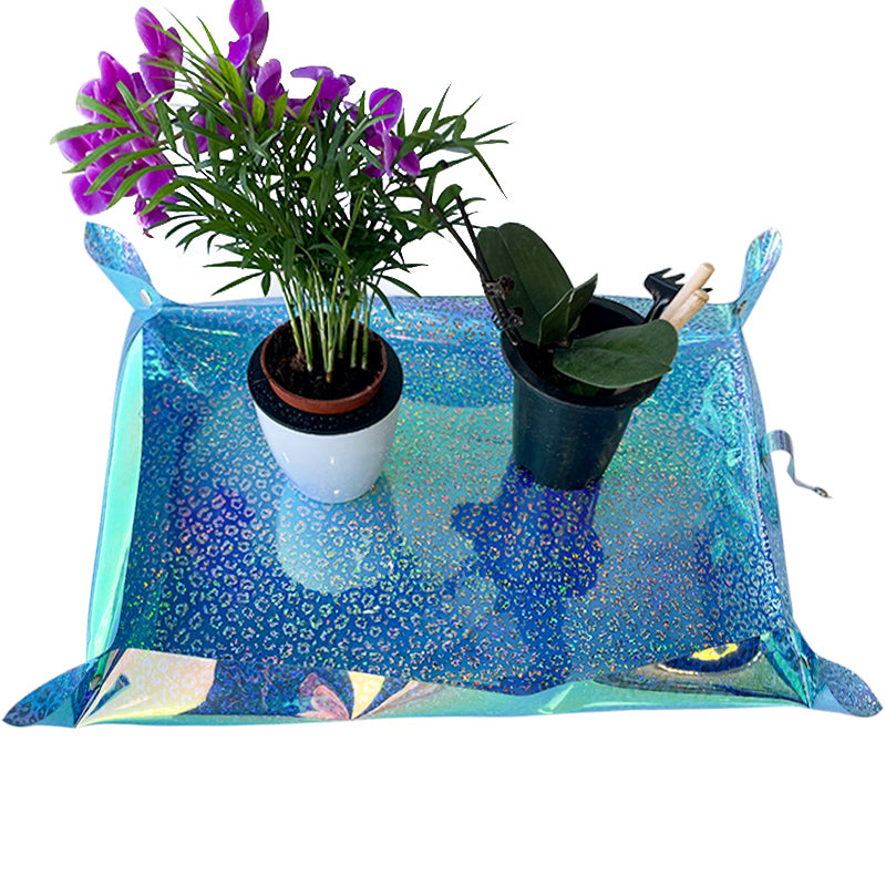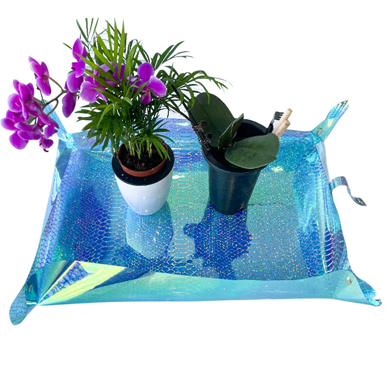 The holographic pink and blue glow makes your plant work feel special—like a little plant-spa day. Even when I’m not using it, I sometimes leave it under my plants as a protective, shiny tray.